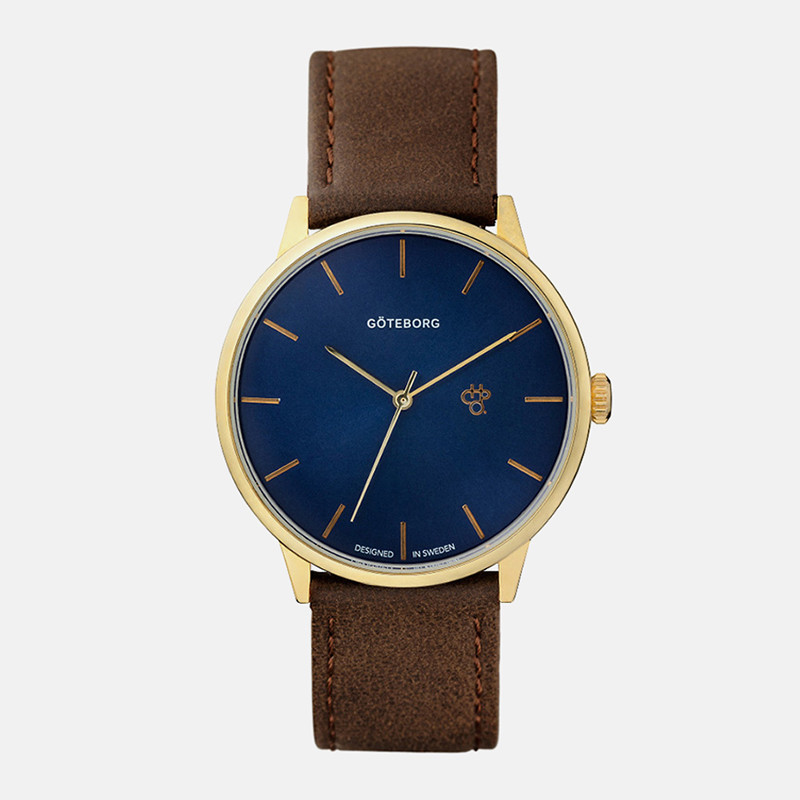 Μοντέρνος, Μίνιμαλ Σχεδιασμός Ο σχεδιασμός του συγκεκριμένου μοντέλου έχει εμπνευστεί από την πόλη Göteborg που είναι η δεύτερη πόλη της Σουηδίας καθώς και το κύριο λιμάνι της. Είναι γνωστή για την αίσθηση του χιούμορ των ανθρώπων της, τις εντυπωσιακές ακτές και τα θαλασσινά. Αποτελείται από αναλογικό τύπο κίνησης, ρυθμιζόμενο λουρί καρπού καθώς και διάμετρο καντράν 40mm. Τα Χαρακτηριστικά του • Τύπος κίνησης: Αναλογικό • Διάμετρος καντράν: 40mm • Λουρί καρπού: 20mmΟικολογικό δέρμα, καφέ χρώμα • Χρώμα καντράν: Μπλε • Χρώμα κάσας: Χρυσό