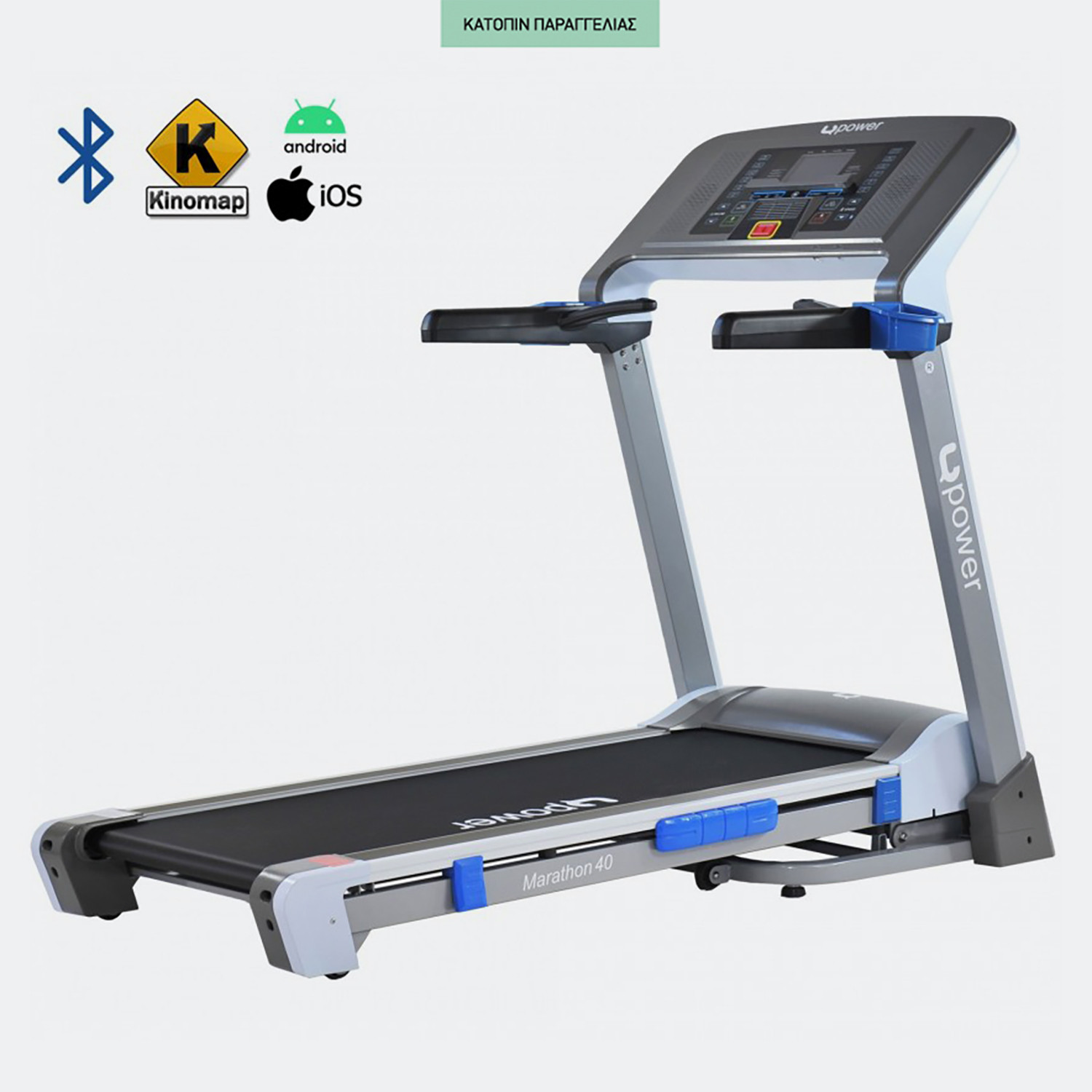 Ο ηλεκτρικός διάδρομος Upower Marathon 40 θα καλύψει και τον πιο απαιτητικό χρήστη. Μέσω της χρήσης του βελτιώνεται η φυσική κατάσταση, η καρδιαγγειακή και αναπνευστική λειτουργία, ενώ παράλληλα συμβάλλει στην ενδυνάμωση των μυών του κάτω κορμού. Ο Marathon 40 αποτελείται από ισχυρό μοτέρ με συνεχή ισχύ 3.0 HP, μέγιστη ταχύτητα 20 km/h και κλίση ηλεκτρικά ρυθμιζόμενη σε 20 επίπεδα. Διαθέτει άνετο τάπητα 140 x 51 cm προσφέροντας μεγάλη επιφάνεια τρεξίματος ώστε να μπορείτε να προπονηθείτε με ασφάλεια. Η συσκευή είναι smart Bluetooth για σύνδεση με το κινητό ή το tablet σας (Android & IOS). Μέσω της εφαρμογής Kinomap μπορείτε να επιλέξετε σε ποιο μέρος του κόσμου θέλετε να τρέξετε, να βρειτε πολλά προγράμματα ανάλογα με τις ανάγκες σας, να συναγωνιστείτε τους φίλους σας και να κοινοποιήσετε τις επιδόσεις σας στην κοινότητα του Kinomap! Τεχνικά Χαρακτηριστικά • Διαστάσεις: 195 x 94 x 51 cm • Ταχύτητα: 1 – 20 km/h • Κλίση: 20% • Βάρος Διαδρόμου: 71 kg • Συνδεσιμότητα Εφαρμογών (Bluetooth App): Fit Show – Kinomap • Προεπιλεγμένα Προγράμματα 25 • Προγράμματα Χρήστη 1 • Έλεγχος Φυσικής Κατάστασης Ναι • Πρόγραμμα Αποκατάστασης Όχι • Έλεγχος Καρδιακών Παλμών (HRC) Όχι • Μέτρηση Σωματικού Λίπους Ναι Extra Πλεονεκτήματα Κομπιούτερ: Η κομψή κονσόλα του Marathon 40 ελέγχει ένα σημαντικό αριθμό παραμέτρων όπου μπορείτε εύκολα και ανά πάσα στιγμή να παρακολουθείτε τις επιδόσεις σας. Όλες οι μετρήσεις απεικονίζονται με ευκρίνεια στη μεγάλη οθόνη οπίσθιου μπλε φωτισμού(ταχύτητα, χρόνος, απόσταση, θερμίδες, καρδιακοί παλμοί, body fat κ.α.). Επίσης, μπορείτε εύκολα να ρυθμίζετε την ταχύτητα και την ηλεκτρική κλίση 20 θέσεων με τα ενσωματωμένα κουμπιά ρύθμισης που βρίσκονται στην κονσόλα ή στις χειρολαβές. Κύριο Πλαίσιο: H στιβαρή κατασκευή και το ανθεκτικό πλαίσιο του διαδρόμου είναι κατάλληλο για χρήστη έως 130 κιλά. Για να αποφύγετε την καταπόνηση στα γόνατά σας το εξαιρετικό δάπεδο και η μεγάλη επιφάνεια τρεξίματος σε συνδυασμό με το αντικραδασμικό σύστημα Gelcushion που αποτελείται από 8 ελαστομερή σημεία εξασφαλίζουν τη μέγιστη προστασία των αρθρώσεών σας κατά τη διάρκεια της προπόνησης. Αισθητήρες Παλμών: Υπάρχουν επίσης ενσωματωμένοι αισθητήρες παλμών χειρός για να σας βοηθήσουν να έχετε πλήρη επίγνωση του τρόπου με τον οποίο η καρδιά και το σώμα σας αντιδρούν στην άσκηση που πραγματοποιείται. Οι αισθητήρες παλμών είναι τοποθετημένοι σε αφρώδη επένδυση μαλακής πρόσφυσης για μέγιστη άνεση κατά τη διάρκεια της προπόνησης. Αποθήκευση: Ο Marathon 40 διαθέτει σύστημα εύκολης δίπλωσης Folding Drop System που επιτρέπει στο διάδρομο να αναδιπλώνεται με μία μόνο κίνηση. Σηκώνοντας το αμορτισέρ με το ένα χέρι μέχρι να κλειδώσει η ασφάλεια του υδραυλικού βραχίονα στήριξης σε συνδυασμό με τους πρακτικούς τροχούς που είναι τοποθετημένοι στη βάση μπορείτε να τον μετακινήσετε για πιο εύκολη αποθήκευση. Εγγύηση: Μοτέρ 2 έτη – Ηλεκτρονικά μέρη 2 έτη – Ιμάντας τρεξίματος 1 Έτος