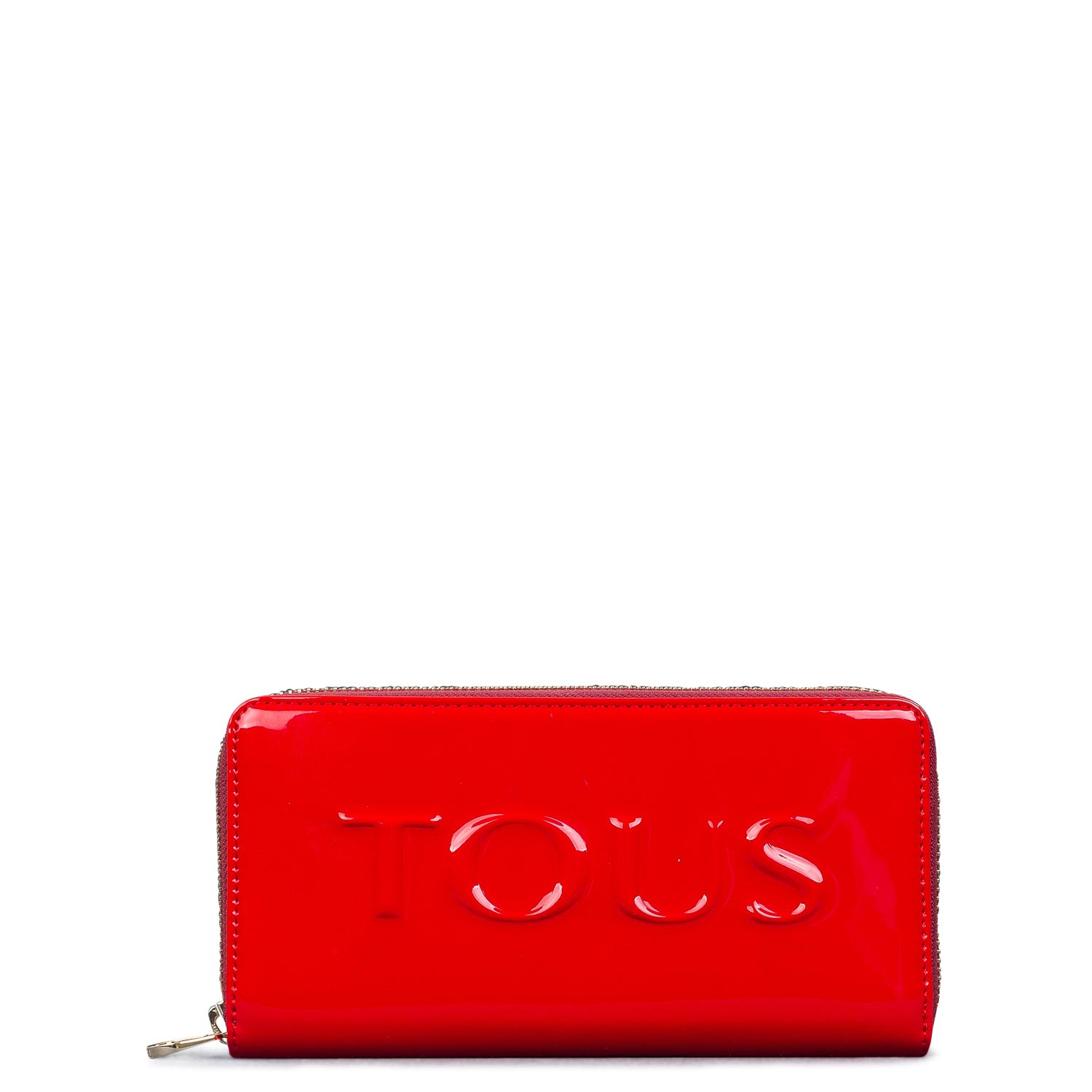 Πορτοφόλι TOUS της συλλογής Grata Dorp από δέρμα λουστρίνι και ανάγλυφο TOUS σε κόκκινο χρώμα. Διαθέτει κεντρική θήκη με φερμουάρ, οκτώ θήκες για κάρτες και δύο επίπεδες τσέπες. Έχει διαστάσεις: 10 x 19,5 x 2,5 cm.