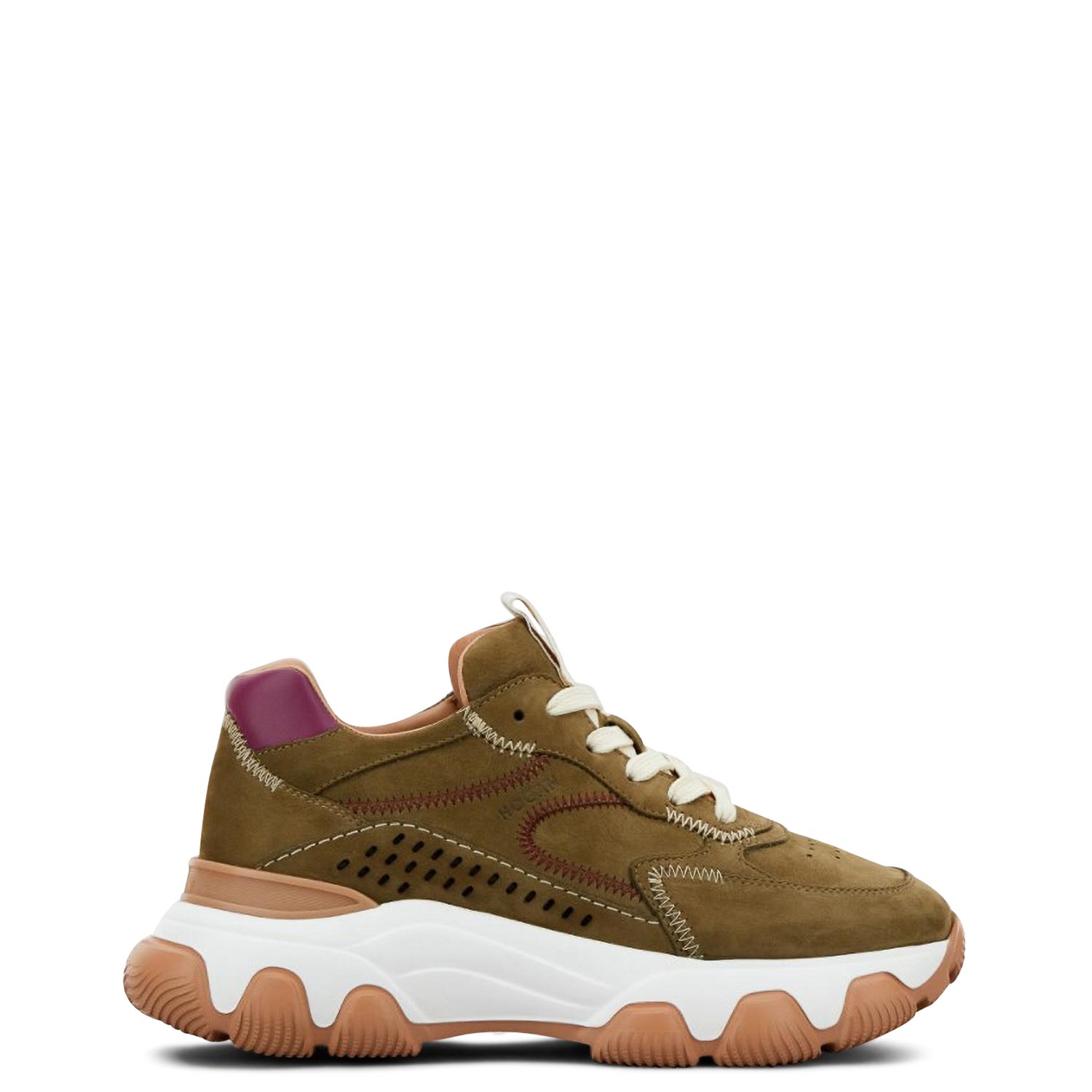 The new, luxury Hogan Hyperactive sneakers represent a dynamic and modern combination, with heritage detailing. The new, extralight, chunky outsole features a sleek trim, perfectly finishing the thermo-formed upper. Crafted in nubuck with side perforations and frayed laces, they feature the Hogan logo stamped on the side and a memory foam insole that guarantees a cushioned fit. The new player in urban lifestyle.