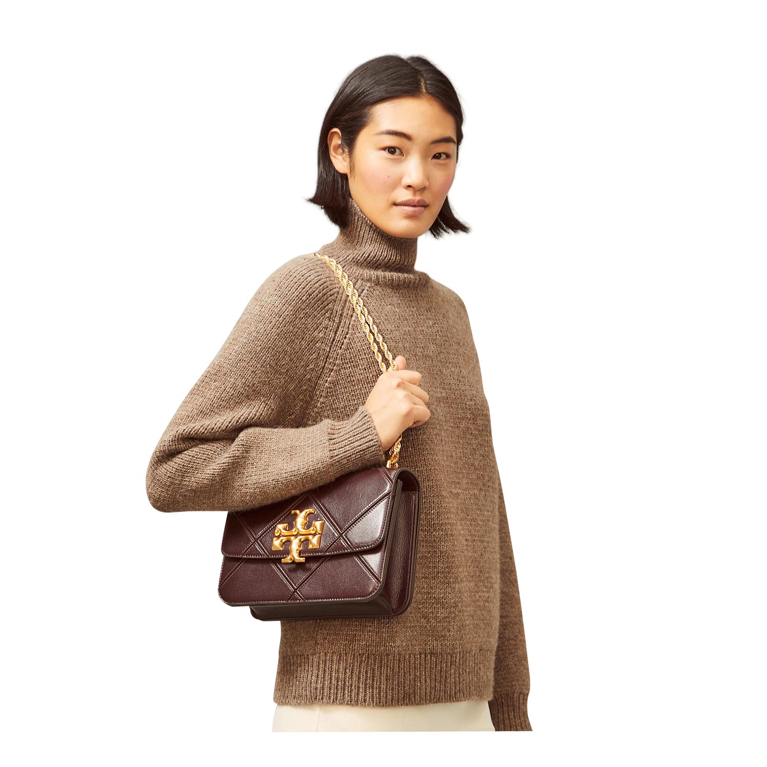 Signature hardware, scaled-up in sculptural brass. From our Fall/Winter 2020 runway, the new Eleanor Shoulder Bag puts extraordinary craftsmanship in focus: soft leather is rolled onto a suede underlay, patchworked and finished with hand-painted edging. Its twisted rope chain is inspired by jewelry, and is convertible: wear it doubled up or long and crossbody. Each handbag takes nine hours to complete.