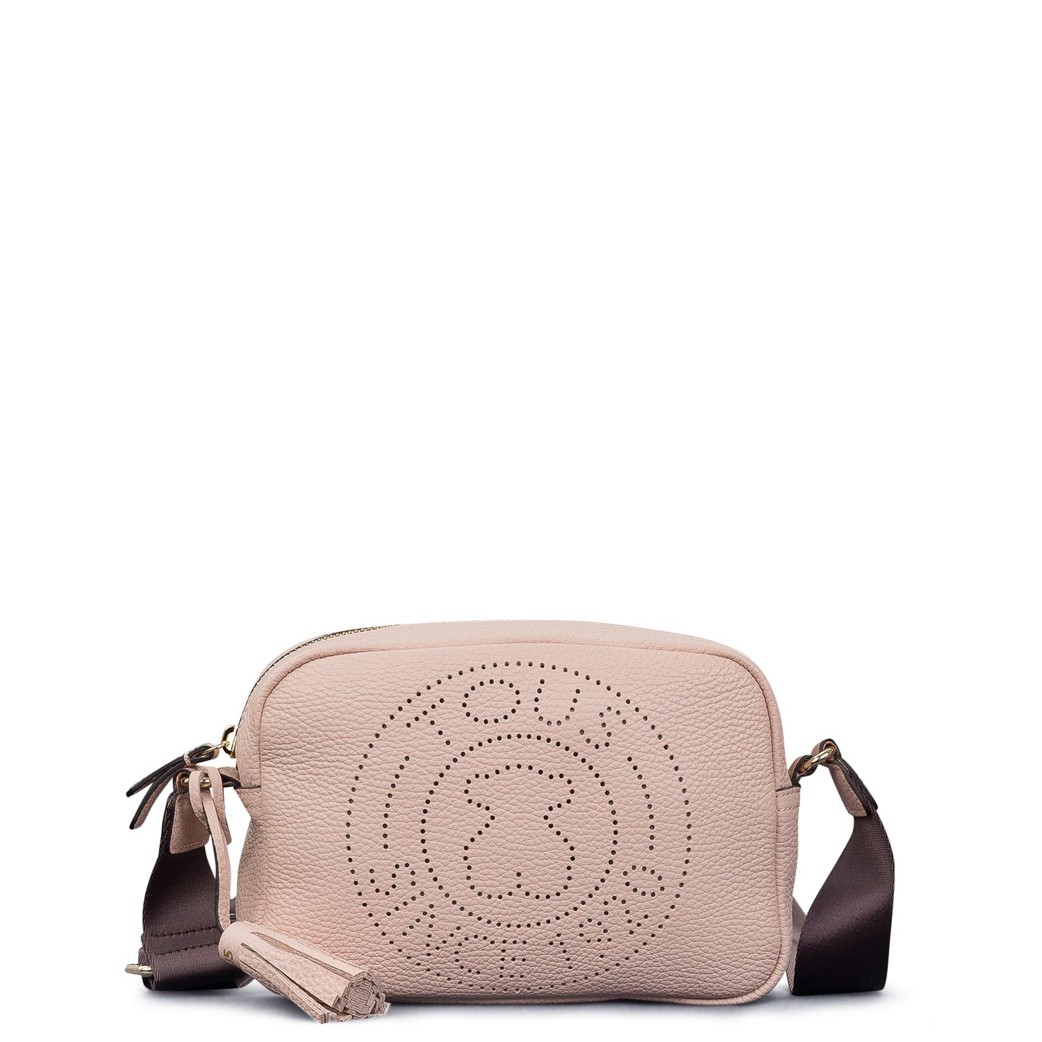 Tσάντα χιαστί της εταρίας TOUS από τη συλλογή Leissa για την γυναίκα. Είναι κατασκευασμένη από διάτρητο δέρμα σε ροζ παλ χρώμα εξωτερικά και δέρμα suede εσωτερικά. Περιλαμβάνει επίσης ένα κόκκινο διακοσμητικό μενταγιόν καθώς έχει διαστάσεις 15,5 x 21 x 7 cm.